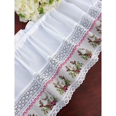Kuchyňská krajková záclonka - vánoční jeleni se srdíčky Rozměry: 32 x 100 cm Tunýlek na tyčku 3,5 cm Záclonka je z jemného bílého batistu doplněného bordurou a paličkovanými...