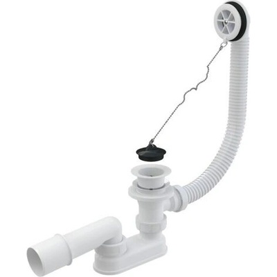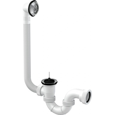 Alcadrain sifon vanový bílý, pro vany standardních rozměrů, s otvorem Ø 5,2 cm, materiál polypropylen, délka 57 cm, krytky chrom, zavírání pomocí zátky, zápachová uzávěrka 5 cm,...