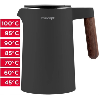 Digitální rychlovarná konvice Concept RK3340 vyniká elegantním dvouplášťovým provedením a displejem. Nabízí objem 1,7 l, možnost regulace teploty a bezpečný cool touch povrchem.