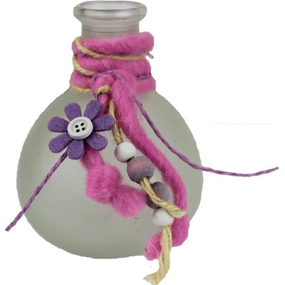 Krásná dekorativní vázička naaranžovaná. Rozměry: 8 x 8 x 10 cm. Materiál: sklo, textil. Barva: čirá, fialová. Výrobek není mrazuvzdorný. Není hračka.