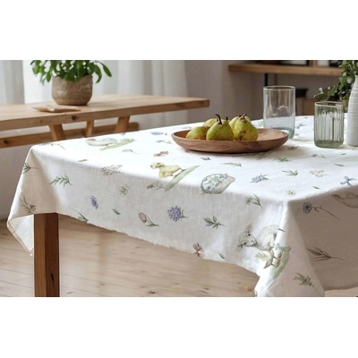 Teflonový obdélníkový ubrus na jídelní stůl s velikonočním vzorem kuřátek a kraslic na béžovém podkladu, vyrobený ze 100% polyesterové látky s vodoodpudivou a nešpinivou...