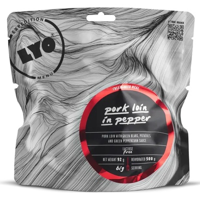 Lyofilizované (mrazem sušené), dehydrované jídlo Vepřové na pepři se zelenými fazolkami a bramborem (Pork Loin in Pepper) od polského výrobce Lyofood. Křehké kostky vepřové...