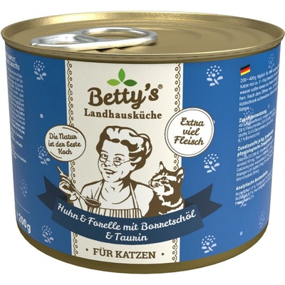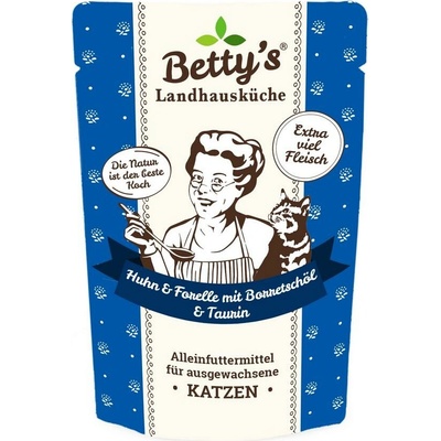 Betty's Landhausküche Fresh Bag Chicken & Pstruh Kuře se pstruhem, brutnákovým olejem a taurinem – „surf a trávník“ pro vaši domácí kočku! Jemná symbióza libového kuřete a...