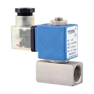 Elektromagnetický nerezový ventil TORK T-SK 603 DN 15, otvor 5 mm, 230 VAC, připojení 3/8", tlak 0-7 Bar, bez napětí zavřený.