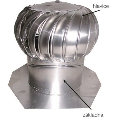 Barvený hliníkový komplet ventilační turbíny se skládá z rotační hlavice, stavitelného krku (od 0°do 45°) o průměru 305 mm a ploché osmihranné základny.
