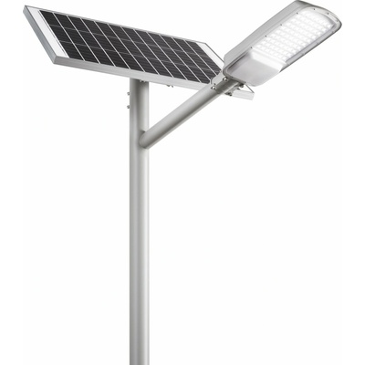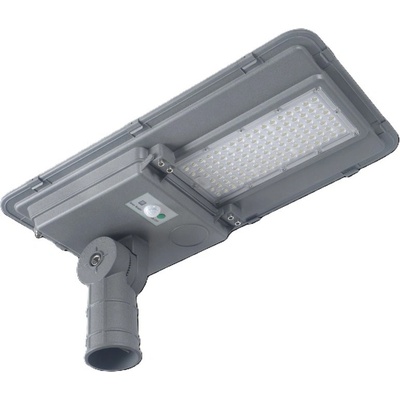 LED solární svítidlo veřejného osvětlení o výkonu 50W s integrovaným solárním panelem 18V/50W a baterií 12V/50 Ah, s čidlem pohybu a soumrakovým senzorem. Krytí svítidla IP65. Osazení Philips Luxeon čipy a ternární lithiovou baterií. Vysoká světelná účinnost 160 lm/W....