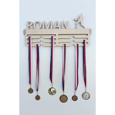 Věšák na medaile se jménem, fotbal Věšák na medaile se siluetou hráče fotbalu a jménem - jméno prosím uveďte v objednávce do poznámky. Vyroben z 8 mm překližky. Za příplatek...