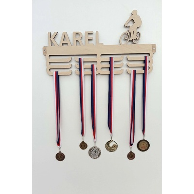 Věšák na medaile se jménem, cyklistika Věšák na medaile se siluetou cyklisty a jménem - jméno prosím uveďte v objednávce do poznámky. Vyroben z 8 mm překližky. Za příplatek je...