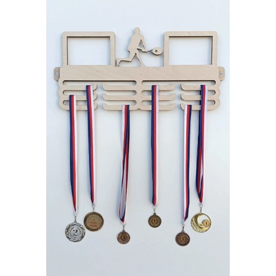 Věšák na medaile s fotorámečkem na 2 ks fotografií, tenis Věšák na medaile se siluetou hráče tenisu. Vyroben z 8 mm překližky s fotorámečky pro 2 ks fotografií o rozměru 15x10...