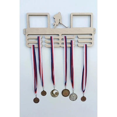 Věšák na medaile s fotorámečkem na 2 ks fotografií, hokej Věšák na medaile se siluetou hráče hokeje. Vyroben z 8 mm překližky s fotorámečky pro 2 ks fotografií o rozměru 15x10...