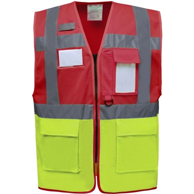 Hi-Vis multifunkční vesta - přední plný zip - 2 boční kapsy s klopami, vlevo našitá náprsní kapsa, integrovaný držák na pero, kroužek k připevnění karty, klíčů, atd. - barvy...