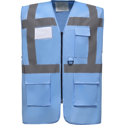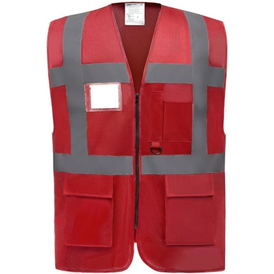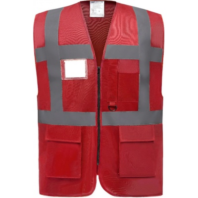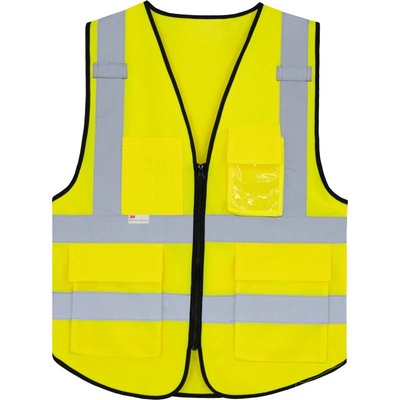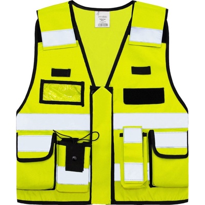 Hi-Vis multifunkční vesta - přední plný zip - 2 boční kapsy s klopami, vlevo našitá náprsní kapsa, integrovaný držák na pero, kroužek k připevnění karty, klíčů, atd. - barvy...