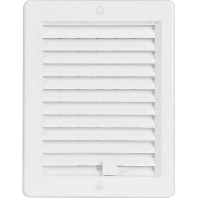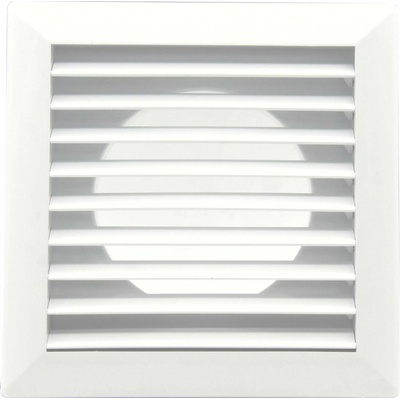 Bílá větrací čtyřhranná plastová mřížka rozměru 187x187 mm, se síťkou proti hmyzu, s odnímatelnou žaluzií, regulace mřížky pomocí páčky, s přírubou průměru 150 mm do plastového...