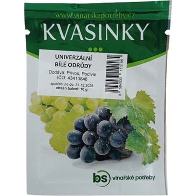 Privos vinné kvasinky univerzální, pro bílé odrůdy, 10 g Univerzální kvasinky určeny pro všechny bílé odrůdy révy vinné. Dávka 10 g kvasinek na 100 litrů moštu vyprodukuje optimální množství životaschopných kvasinek.
