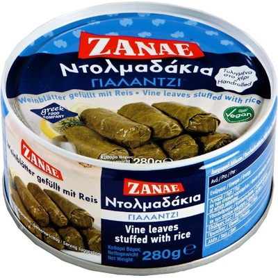 Dolmadákia - vinné listy plněné rýží 280g ZANAE Jednou z nejoblíbenějších specialit středomořské stravy jsou vinné listy plněné rýží. Vyrábí se z pečlivě vybraných jemných vinných listů sbíraných na jaře, vysoce kvalitní rýže a dalších surovin podle tradiční receptury....