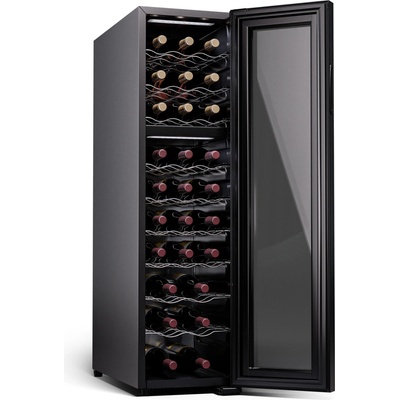 WIE Chladnička na víno, 1 zóna, 33 litrů, 12 lahví, malá lednička na víno, mini lednička na víno se skleněnými dvířky, designové dveře s dotykovým LED panelem, ochrana před UV zářením Krátký popis: Elegantní chladnička na víno WIE 33L pojme až 12 lahví. Vybavena...