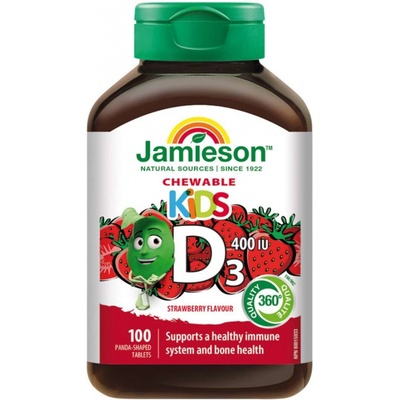Jamieson vitamin D3 kids 400 iu tablety k cucání s jahodovou příchutí pro děti 100tbl Vitamin D je nezbytný pro správný růst a vývoj kostí u dětí a přispívá ke správnému...