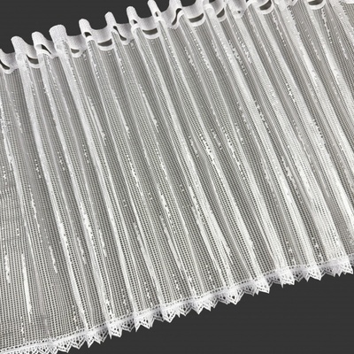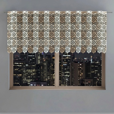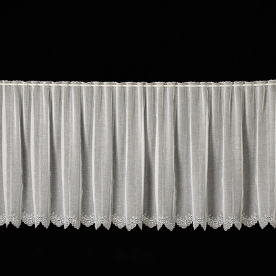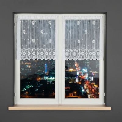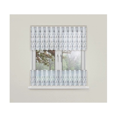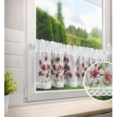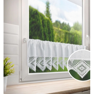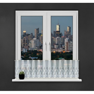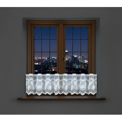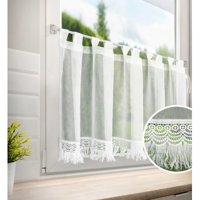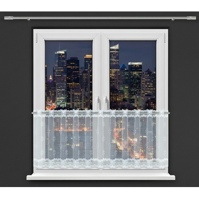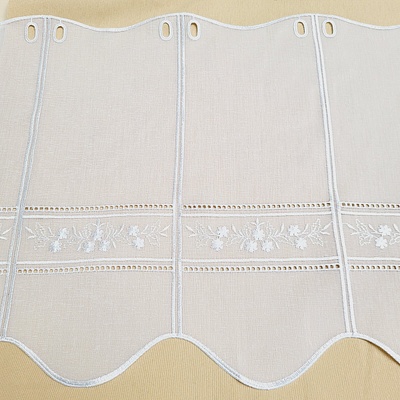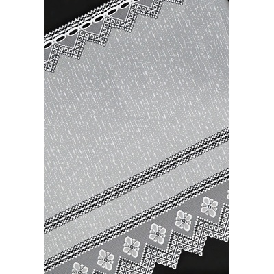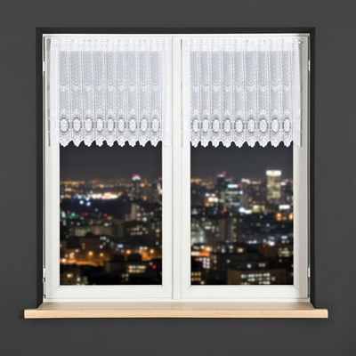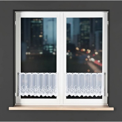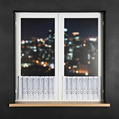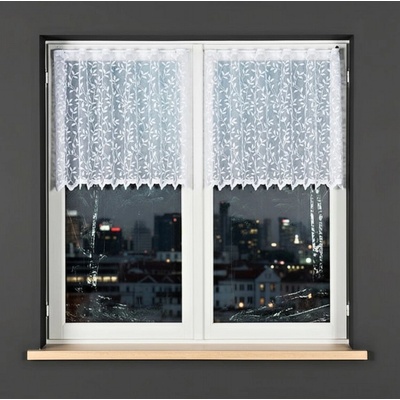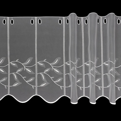 Metrážová voálová vitrážová záclona se vzorem vyšívaných lístků na bílé zakončená obloučky, ve vrchní části s oky na zavěšení na tyč. Záclona je vyrobena ze 100% polyesteru a...