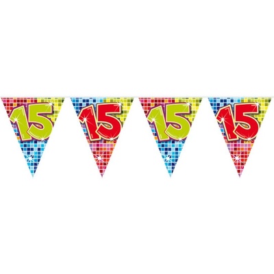 Narozeninový vlaječkový mini banner s číslem 15 barevný, výška 12 cm, délka 3 m.