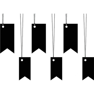 Jmenovka - visačka z černého papíru - 2 velikosti 3,5x7cm, 4,3x9cm 2 provázky - černý a bíločerný každý o délce 4,5m. balení: 6ks (3 ks od každého rozměru)