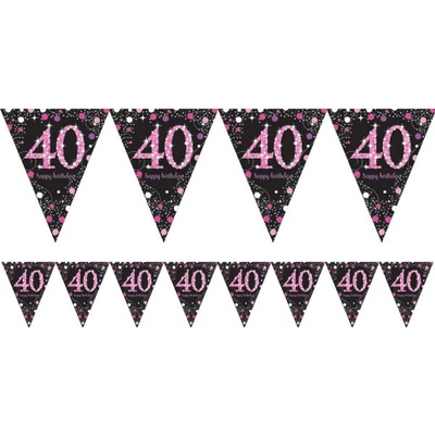 Narozeninový vlaječkový banner s číslem 40 a malým nápisem Happy Birthday na každé vlajce v černo-růžovém provedení s holografickými prvky (duhově třpytivý efekt), výška 21,5...