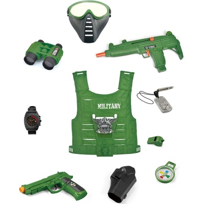 Super vojenská sada pro každého vojáka! Sada pro malého vojáka s helmou, pistolí a dalším příslušenstvím. Set vyžaduje 2 x 1.5V AG13 baterie, které nejsou součástí balení.