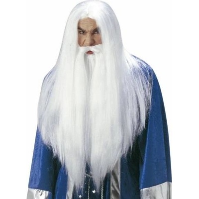Karnevalová paruka čaroděje s vousy. Vousy se uchytí gumičkou za uši. Barva: bílá Určeno pro: pánská Typ paruky: dlouhá, rovná Materiál: 100% polyester