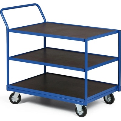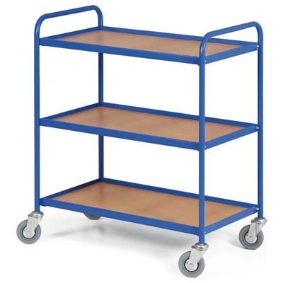 Kovové vozíky se třemi policemi vhodné pro přepravu materiálu a předmětů ve skladech.Police jsou výškově nastavitelné a potažené laminátovou vrstvou.Mřížované bočnice ze dvou...