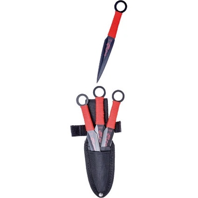 Velké vrhací nože "KUNAI RED" - 3 ks Krásná sada 23 cm dlouhých vrhacích nožů, která obsahuje hned 3 kousky z nerezové oceli 440C! Hroty jsou oboustranně zbroušené, špička je tedy velice ostrá - vyndávejte nože z terče opatrně. Vrhací nože jsou z v černém designu....