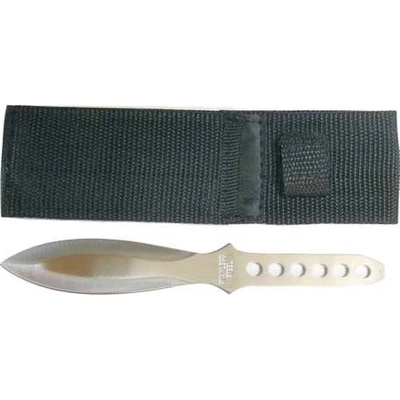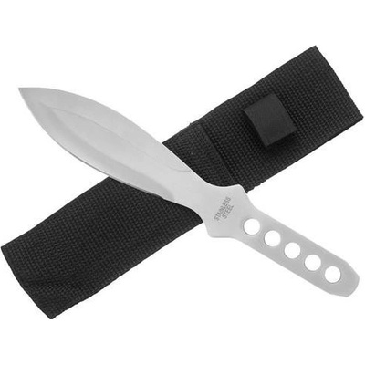 -nerezový plochý vrhací nůž -vyrobeno z jednoho kusu materiálu -odlehčovací otvory na tvarované čepeli -nylonové pouzdro pro přichycení k opasku