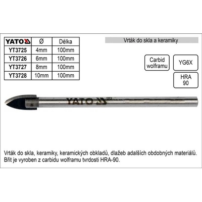 Vrták do skla, keramiky, keramických obkladů, dlažeb adalších obdobných materiálů. Břit je vyroben z carbidu wolframu tvrdosti HRA-90. Technická data Materiál YG6X Průměr, ,...