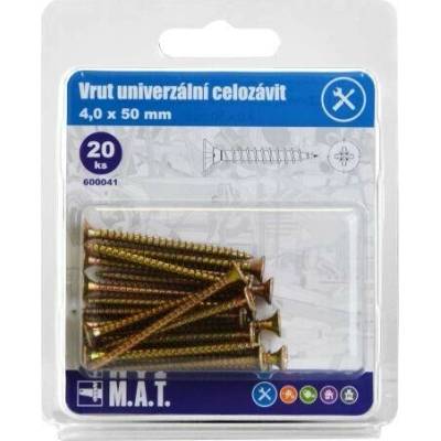rozměry (pr. x D)): 4,0 x 50 mm materiál: Zn celozávit 20 ks Univerzální vrut je spojovací součástka s vnějším závitem, určená k vytváření rozebíratelných spojů především...