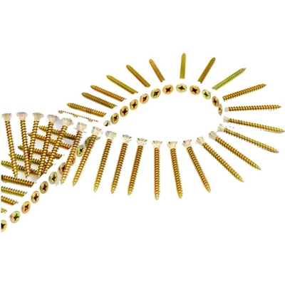 Páskované univerzální vruty do dřeva 4x50 mm, zinek žlutý, zápustná hlava, křížová drážka PZ Balení: 1000 ks pásky s vruty lze použít ve většině značek – např.: Makita, Bosch,...