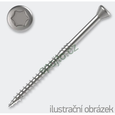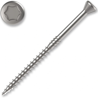 Terasové nerezové vruty 4,5x60 mm s malou zápustnou hlavou vhodné pro modřín, smrk a termodřevo Profesionální vruty pro dřevěné terasy, venkovní obklady a fasády Speciální řezná...
