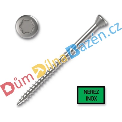Vrut pro terasy s čočkovitou hlavou 5x70 mm, nerez Speciální nerezový terasový vrut, který odolává korozi a je vhodný pro venkovní použití se zvyšenou vlhkostí. Vruty mají...