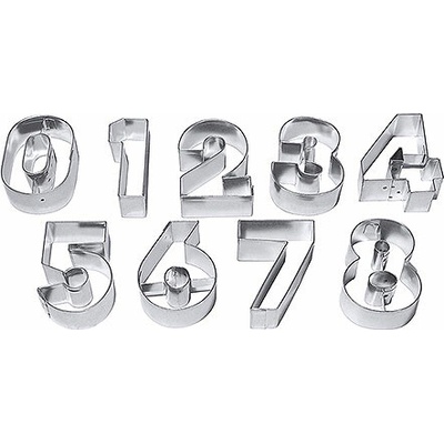Vykrajovací formičky ve tvaru číslic 0 až 9 jsou ideální k vykrajování ozdob z marcipánové hmoty na dorty a zákusky. Sada 9 ks. Materiál: nerez. Rozměry: v. 3,5...