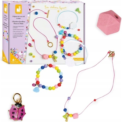 Kreativní sada na výrobu šperků francouzské víly značky JANOD vám umožní vytvořit celkem až 6 kusů ozdob: náhrdelník, 3 náramky a 2 prsteny. Její součástí je mnoho korálků v různých tvarech a barvách (m.in. ve tvaru motýlů), stejně jako světle zelený provázek, bílá...