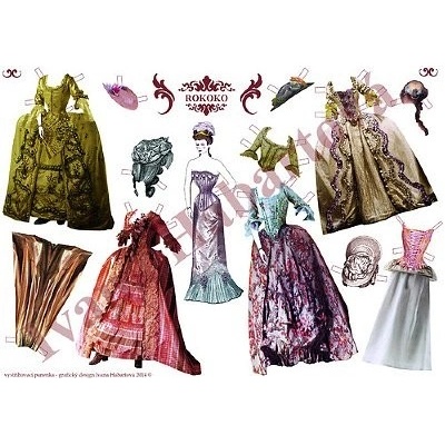 Rokoková vystřihovací panenka Věk: 4 + Papírová rokoková panenka na vystřihování a oblékání. Panenku můžete obléci do pěti různých šatů, dále tu najdete halenku a dlouhou sukni...