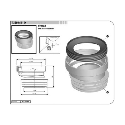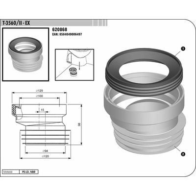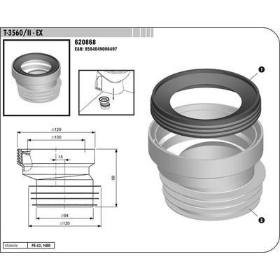 \n\nmanžeta pod toaletu T-3560 / II - EX \nhorní připojovací průměr 100 mm \nEAN 8584049006497\n\n