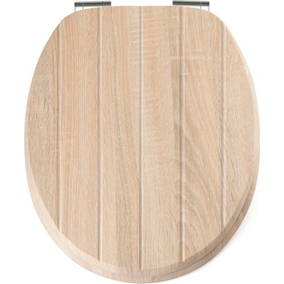 WC sedátko Edessa je vyrobeno z pevné a odolné MDF desky, potažené kvalitní dýhou vysoce imitující pravé dřevo. Víko má ozdobné drážky imitující prkna, které dodávají prkénku...