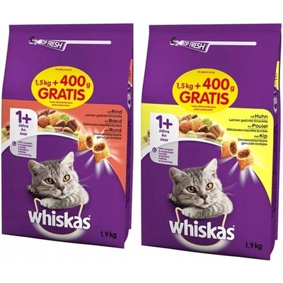 WHISKAS MIX krmivo hovězí kuře 2x 1,5 kg + 0,4 kg - 1x Hovězí maso 1,5 kg + 400 g Dárek - 1x Kuře 1,5 kg + 400 g Dárek WHISKAS® je plnohodnotné suché krmivo s paštikami pro dospělé kočky. Jeho složení bylo vyvinuto veterináři a odborníky na péči o pleť Výživa z...