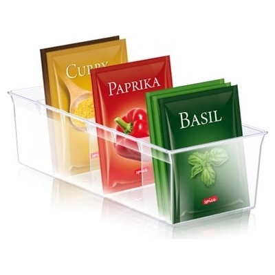 Plastový zásobník do kuchyně, který zajistí přehledné uspořádání sáčků s kořením. Je opatřený pěti přepážkami, které vytváří šest samostatných sekcí. Díky tomu rychle a snadno najdete právě to koření, které zrovna potřebujete.