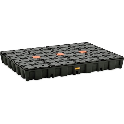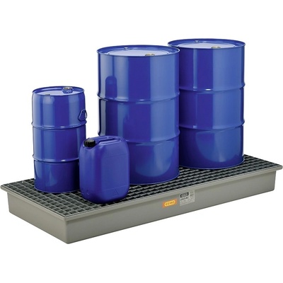 Ocelová lakovaná záchytná vana s žárově zinkovaným roštěm. Záchytná vana pro skladování 4x 200 l. Provedení s roštem usnadňuje manipulaci se sudy. Vybaveno pro manipulaci VZV...