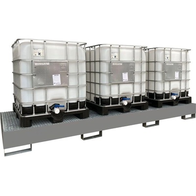 záchytná jímka s nosným zinkovaným roštem pro skladování 3 ks IBC kontejnerů o objemu 1000 l rozměry umožňují uložit kontejnery příčně i podélně lak RAL7040 pevná a...