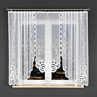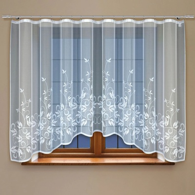 Krásná bílá záclona s kytičkovou bordurou se bude hodit do okna v obývacím pokoji či ložnici. Motiv je umístěn ve spodní a střední části záclony. Spodní lem tvoří obloučky....