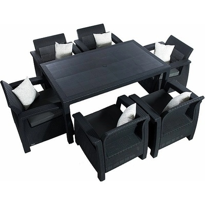 Šest pohodlných křesel s polstrováním a velký jídelní stůl, to je Corfu Lounge Set II. 1+6 z umělého ratanu – ideální posezení pro celou rodinu. Materiálem sestavy Corfu Lounge...
