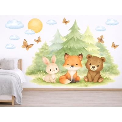 Samolepka na zeď Liška, zajíček a méďa přenese dětský pokoj do kouzelného lesního světa plného klidu, pohody a přátelství. Roztomilá trojice lesních kamarádů sedící před jemnými...