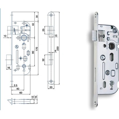 Zadlabávací zámek, jednozápadový bez převodu s otvory pro dělené štíty, pravolevý. Součástí balení je jeden klíč. - Rozteč: 90 mm- Zádlab: 60 mm- Hloubka klíče: 40 mm- Výška čela: 230 mm- Šířka čela: 20 mm- Výška těla: 170 mm- Otvor: obyčejný klíč- Převod: -- Počet...
