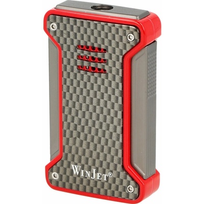 Tryskový zapalovač Winjet Torch Red/Grey. Kovový zapalovač v moderním designu v červeno šedé kombinaci a povrchem imitující karbon. Okénko se stupnicí umístěné na levé straně...