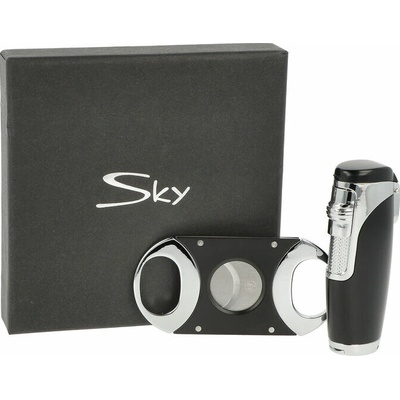 Dárková doutníková sada Sky. Sada pro kuřáky doutníků obsahuje kovový doutníkový zapalovač a dvoubřitý doutníkový ořezávač v černo chromovém lesklém provedení. Tryskový...